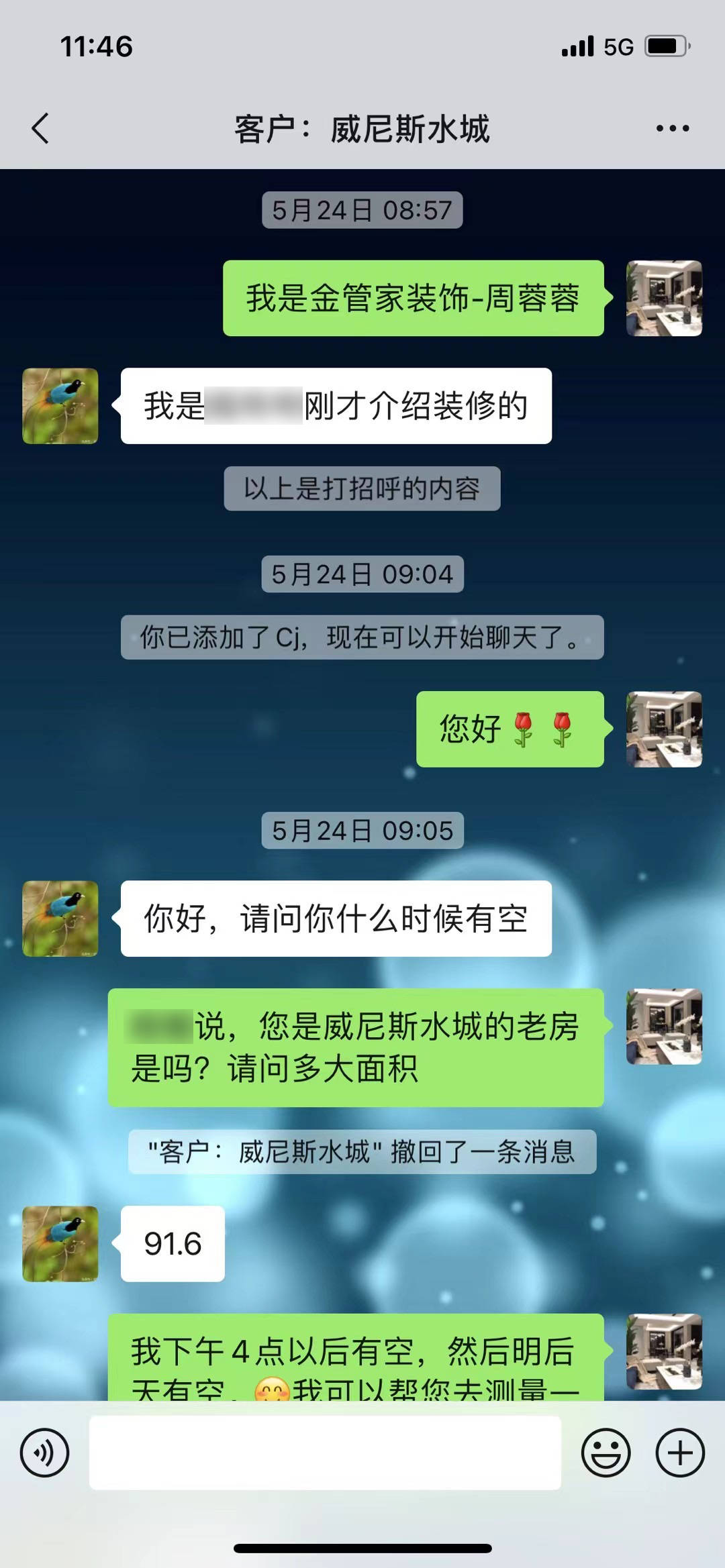 老業(yè)主與金管家裝飾設(shè)計(jì)師微信聊天截圖